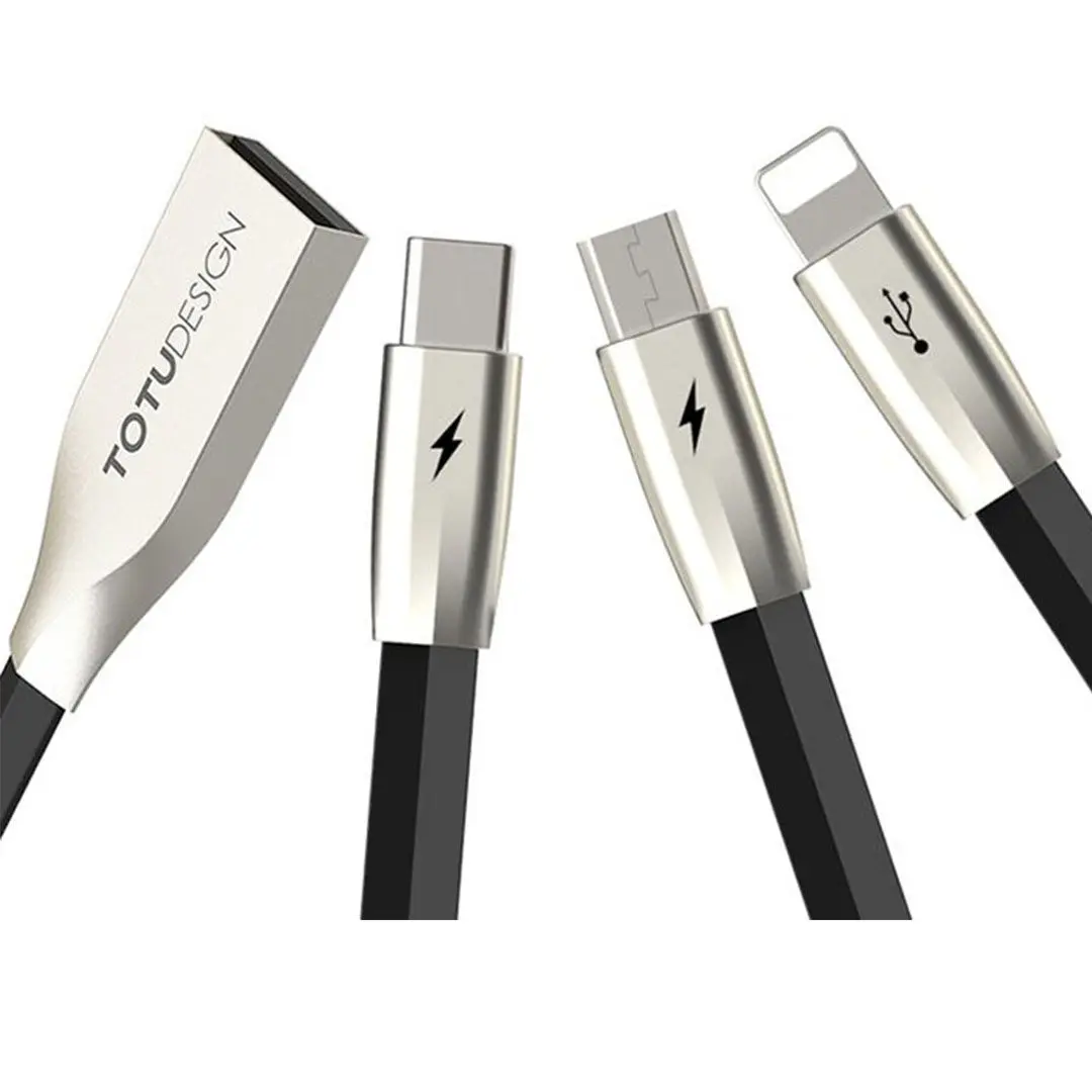 Zinc Alloy محصول جدید شرکت توتو دیزاین “Totu Design” می باشد که یک تبدیل یک به سه محسوب می شود. شما با استفاده از این محصول می توانید از یک پورت یو اس بی سه خروجی پرکاربرد USB Type-C، لایتنینگ و میکرو یو اس بی را در اختیار داشته باشید. از این رو به راحتی می توانید گوشی ها و محصولات تولید شده توسط شرکت های مختلف را شارژ کرده و دیتای آن ها را منتقل کنید. طول این کابل 1.5 متر می باشد که از دو قسمت تشکیل شده است. قسمت اول کابل از پورت USB تا بخش میانی است که 50 سانتی متر بوده و قسمت دوم نیز از بخش میانی تا پورت های خروجی را شامل می شود که یک متر طول دارد. طراحی محصول زیبا بوده و به صورت تخت و ضد گره ساخته شده است.