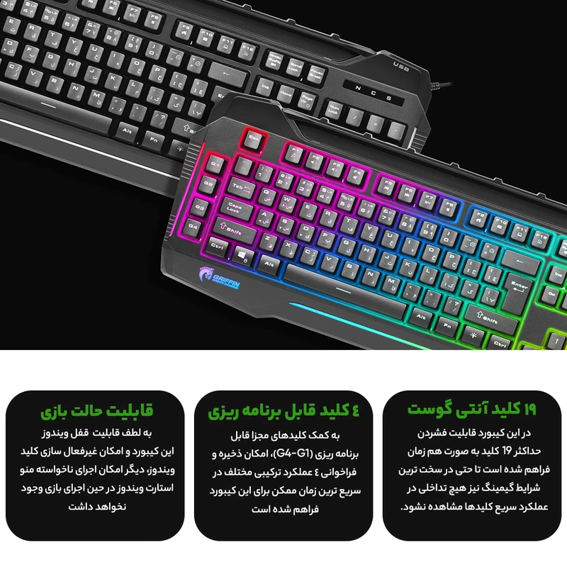 جنس: پلاستیک ABS مقاوم, دارای 19 کلید آنتی گوست با قابلیت فشردن همزمان کلیدهای مختلف در هنگام اجرای بازی های رایانه ای, کلید های شبه مکانیکی با طول عمر و دقت بالا, طراحی ارگونومیک